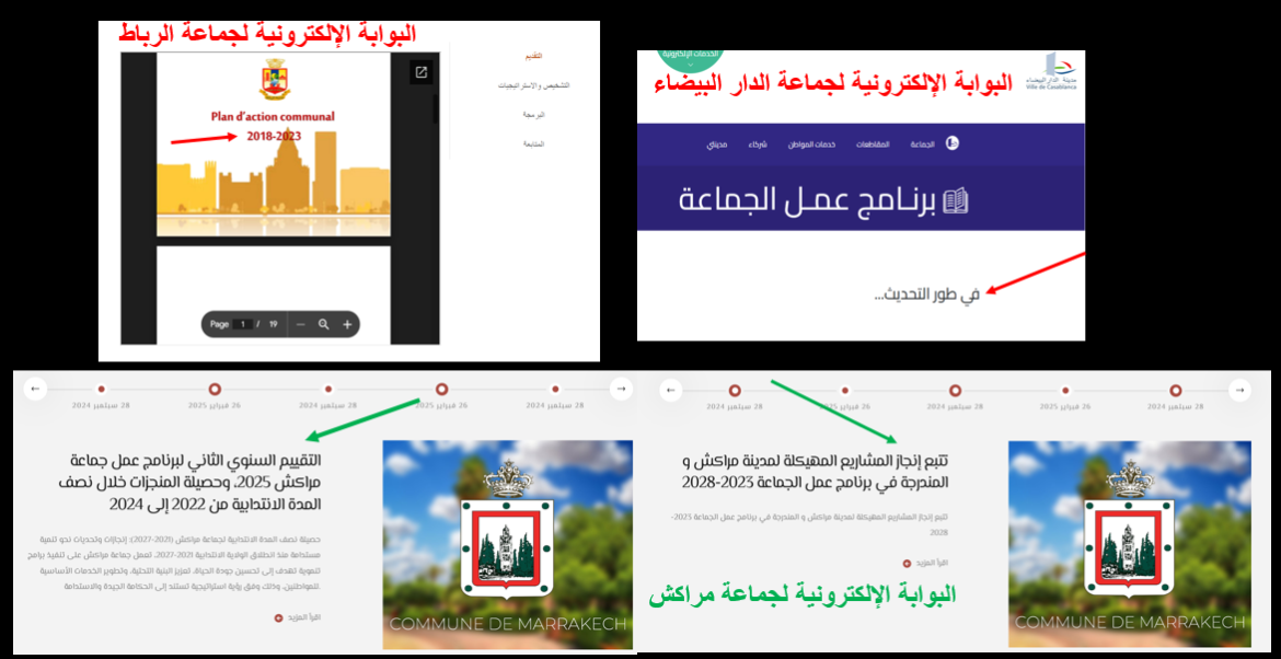 وحتى لا نرى الوجه المظلم فقط ، نسوق مثال جماعة مراكش التي تنشر عبر موقعها تقارير التقييم السنوي لبرنامج عمل الجماعة، وحصيلة المنجزات خلال نصف المدة الانتدابية من 2022 إلى 2024 وتقرير تتبع إنجاز المشاريع المهيكلة لمدينة مراكش و المندرجة في برنامج عمل الجماعة 2023 – 2028. وهذا يدل على أن الجماعة تأخذ بالجدية اللازمة مسألة التواصل مع الساكنة ومع المحيط الخارجي للجماعة وهو ما يدل على تملك الممارسات الفضلى في هذا المجال.